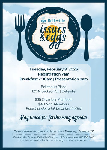 Issues & Eggs Share: Name: Issues & Eggs Date: February 3, 2026 Time: 7:30 AM - 10:00 AM CST Registration: Register Now Event Description: Stay tuned for forthcoming agenda! To Current Calendar Location: Bellecourt Place 120 N Jackson St. Belleville, IL Date/Time Information: Tuesday, February 3, 2026 Registration 7am Breakfast 7:30am | Presentation 8am Set a Reminder: Enter your email address below to receive a reminder message. -- Select Days Before Event -- 1 Day 2 Days 3 Days 1 Week Captcha Validation Please complete the Captcha To Current Calendar ShareTweetShare0 Shares ShareTweetShare0 Shares