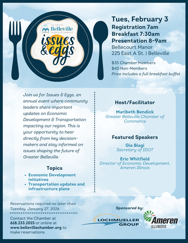 Join us for Issues & Eggs, an annual event where community leaders share important updates on Economic Development & Transportation impacting our region. This is your opportunity to hear directly from key decision-makers and stay informed on issues shaping the future of Greater Belleville.